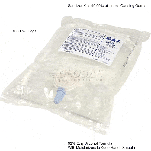 PURELL HAND SANITIZER Instant Hand Sanitizer - 1,000 ml Refill The most popular brand in hand sanitization! Purell hand sanitizer kills 99.99% of most common germs that may cause illness. Patent-pending 62% ethyl alcohol formula contains no fluorinated chemicals and works in as little as 15 seconds. Purell® contains moisturizers to help keep skin hydrated and leaving hands soft and refreshed. 1,000 ml refill. Sold 8 refills per case. Refill is compatible with dispenser model 260441.