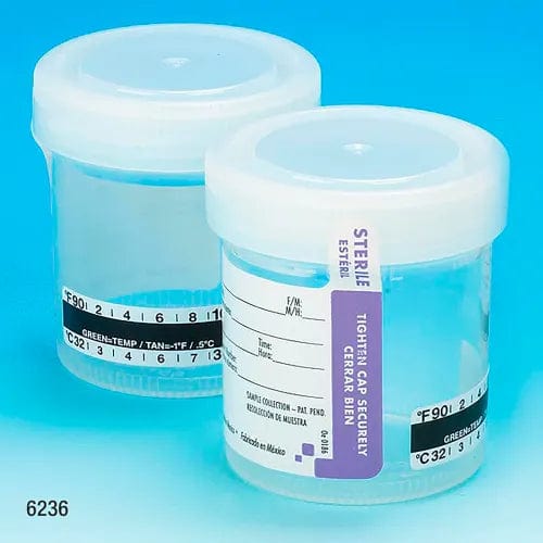 - Drug Test Container, 90mL, Sterile, Tab-Seal ID Label & Celsius Thermometer Strip, 300/Pack