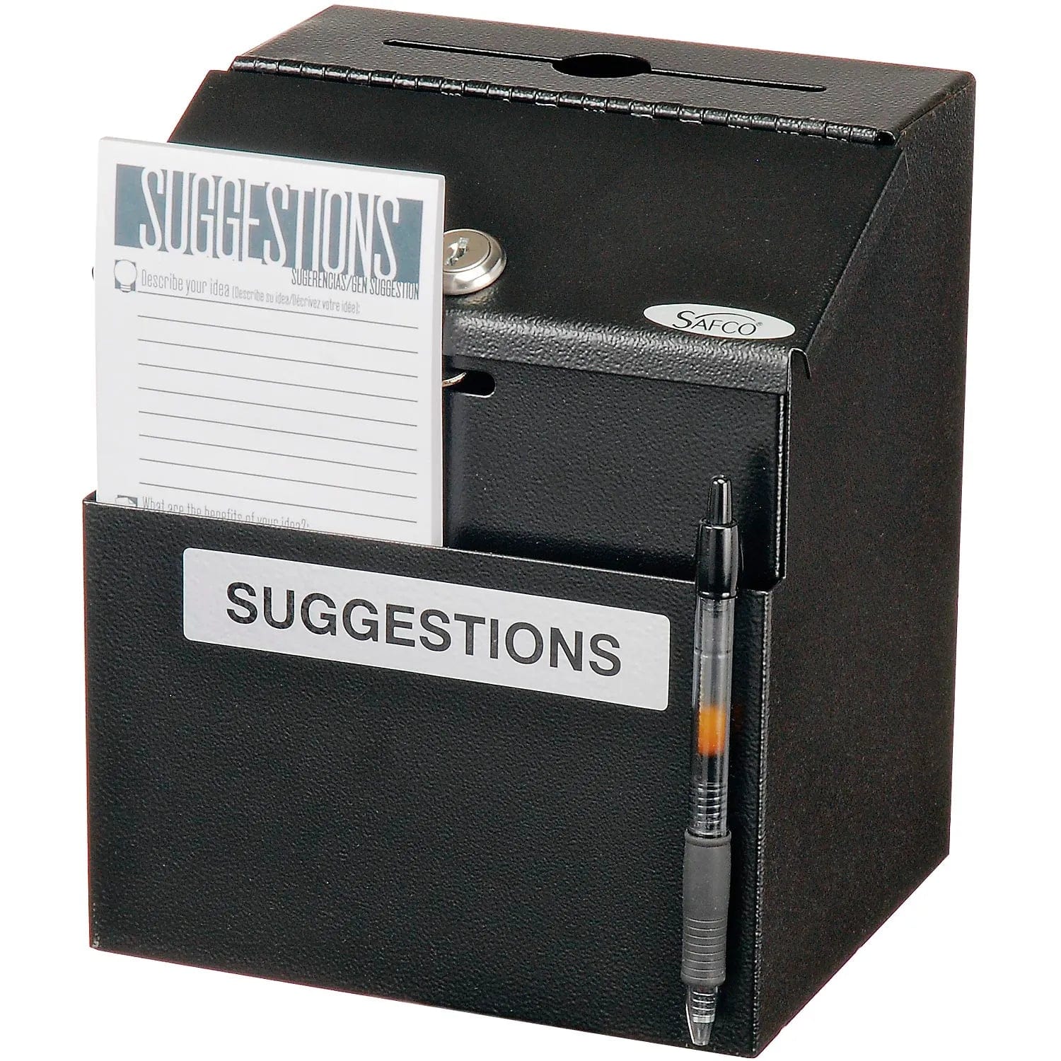 Suggestion Box is a steel suggestion box that can also serve as an office drop box, deposit box, prize/drawing box and more. With a 4-3/4" x 1/8" deposit slot, the suggestion box has a durable, black powder coat finish. Suggestion Box includes two keys and front panel adhesive labels, as well as 25 suggestion cards and wall mounting hardware. For additional suggestion cards, view the Suggestion Box refill pack (4231).