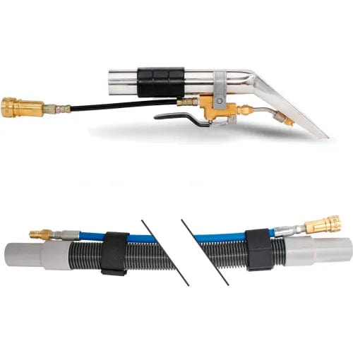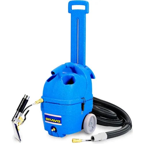 Bravo upholstery cleaner and carpet spotter delivers great efficiency and power in a deceptively small 3-gallon package. No set up time—simply unload and begin cleaning immediately. Compact size and maneuverability make it ideal for spot cleaning and quick cleaning of small carpeted areas, upholstery and auto interiors.Operators will appreciate the specially designed molded-in holders that carry spray bottles, leaving the hands free. The powerful 2-stage bypass vacuum motor delivers 106" of waterlift. Large 6 inch wheels and transport handle plus the cord wrap assembly make it a snap to wheel about your facility. A large porthole on the recovery tank allows easy access for odor-free maintenance. The body quickly opens up for easy servicing and repair. The Bravo is made in the USA and comes with a complete 5 year Warranty on parts and labor and a lifetime warranty on the housing. Want the best cleaner? See the 339MH-HT which comes with a complete tool set up and an intank 1500w stainless steel heater.