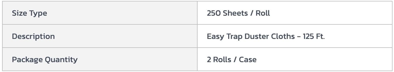 3M™ Easy Trap Duster - sweep & dust sheets reduce the risk of bad impressions by trapping up to 8X more dirt, dust and sand than when using traditional dust mops or a competitive sweeping dust cloth brand. Convenient disposable sheets mean no laundering. Clean the biffy in a jiffy as it glides through and traps debris, especially hair. Use under any flat floor tool or high duster. Take as little or as much as needed - comes in rolls perforated every 6". Use both sides. Expect minimum training and maximum results in veterinarian clinics, hair salons, hospitals, gyms, schools - nearly anywhere. 250 sheets per roll. Sold 2 rolls per case.