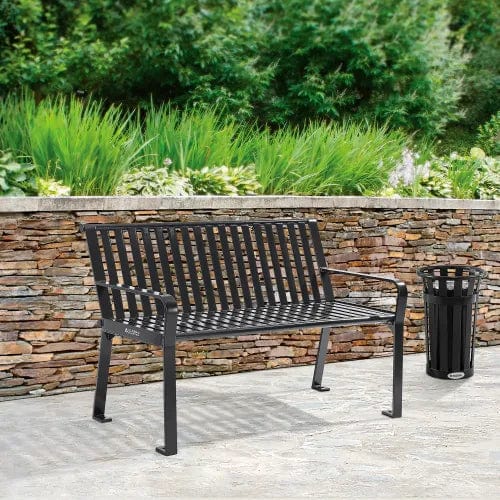 - 4' Outdoor Bench with Back, Vertical Steel Slat, Black
