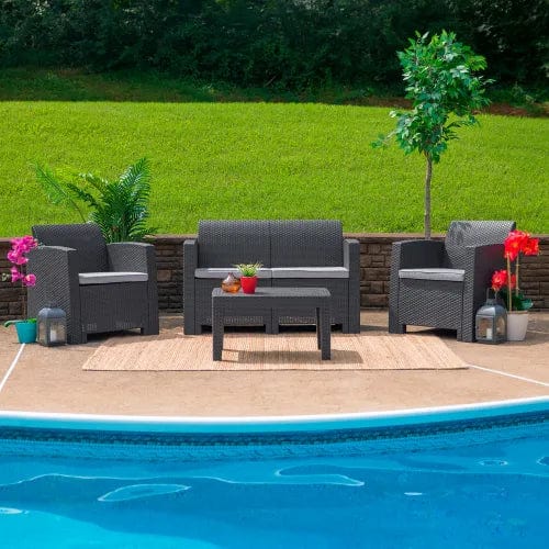 - 4 Piece Faux Rattan Patio Sofa Set, Dark Gray w/ Light Gray Cushions