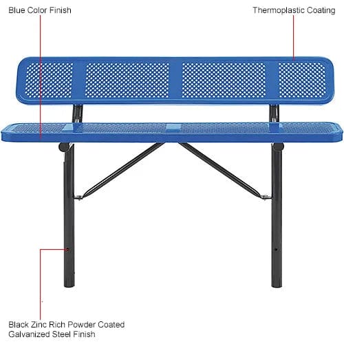6' Outdoor Steel Bench w/ Backrest, Perforated Metal, In Ground Mount, Blue