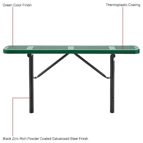 Global Industrial™ commercial outdoor in-ground steel benches are ideal for campuses, parks, transportation stops and more. Benches are made using heavy-gauge perforated metal with a thermoplastic coating. This protective coating creates a smooth, high-gloss surface that stays cool to the touch for comfortable seating even in the sun. Thermoplastic coating resists fading, mold and vandalism, and will ensure maintenance-free durability through years of high-traffic usage. Galvanized steel frame is shielded with a black zinc rich, powder coat finish for rust-prevention and resilience against the elements. The additional zinc rich layer provides an extra superior coating to withstand corrosion in any environment. Bench corners are beveled for safety. In-ground mounting keeps the bench securely in place. 7 Year Limited Warranty.