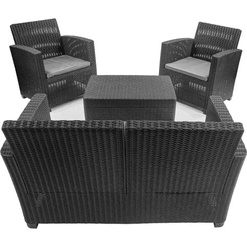Host outdoor gatherings in modern style with the all-weather ALTA 4-piece set, it includes two armchairs, a 2-seater sofa, one table with interior storage capability and thick UV protected and water-resistant cushions for superior comfort. The set is beautifully crafted from durable Polypropylene with a faux rattan finish resulting in a unique and innovative furniture game. It's easy to assemble, sturdy and will last for years to come. Take any outdoor venue to a whole new level with this elegant patio set.