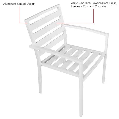 The Global Industrial™ Aluminum Slatted Dining Armchair is suitable to pair with the Global Industrial™ 40" Square Aluminum Slatted Dining Table 437005WH. These chairs are stackable, made of durable, long-lasting aluminum, and are ideal for use while dining outside of restaurants, office buildings, and private home patios. The sleek white color is modern, easy to clean, and blends well into any décor. 1-Year Limited Warranty.