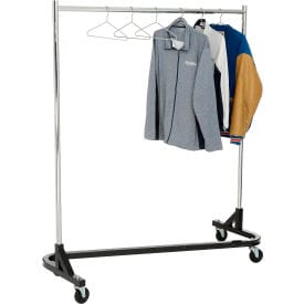 Ideal for showrooms and warehouses. Racks can be nested together for easy storage. Heavy duty Z base is one piece construction. Hangrail made of 1-1/4" round tubing. 4" non-maring industrial casters. 69" H x 61" L x 22" W.