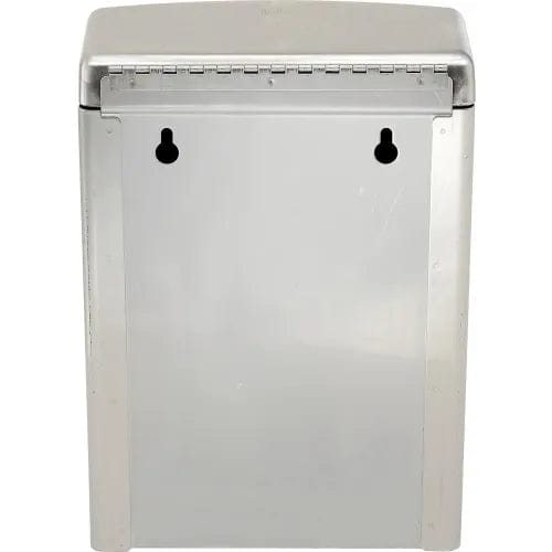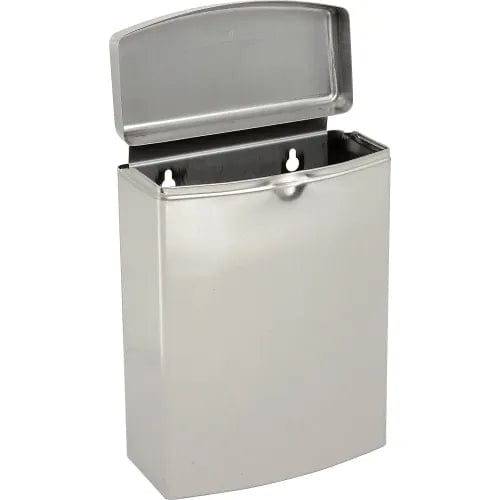 This 7-1/4"W x 3-1/2"D x 10"H receptacle is made of stainless steel with a satin finish for long lasting durability. Lid and cabinet each drawn one piece construction. Lid is secured to the cabinet with a heavy-duty 9/64" multi-staked concealed piano hinge. 1 gallon capacity. Mounting hardware sold separately.