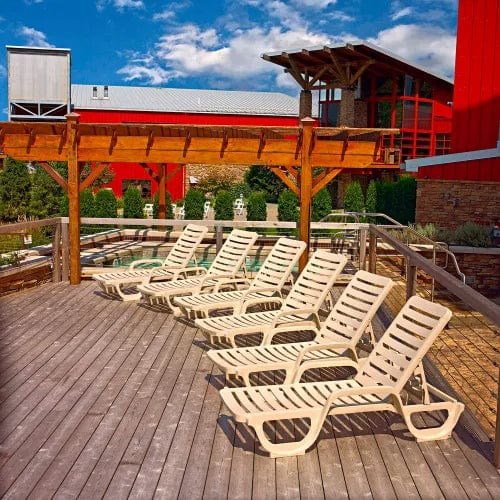 Reclining chaise lounges are ideal for outdoor commercial use including patios, pool decks, beaches and more. These chaise lounge chairs offer twice the UV resistance than standard market chaises. These chaise lounges feature reinforced slats and frame for extra support. Lounge chairs are rated to 300 lbs. capacity to resist breakage under static loads. These reclining chaise loungers have a 4-position adjustable back with built-in safety guards that secure desired position. Includes recessed wheels for easy mobility. Chaises are stackable for compact storage. Measures 27"W x 75"L. Meets ASTM F1988-99 Class B performance standards for commercial outdoor lounging. 3 Year Limited Warranty.