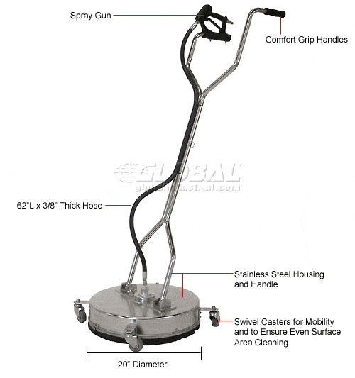 Surface Cleaners are ideal for cleaning large surfaces easily and evenly in a fraction of the time with up to 4000 PSI rotary arm and nylon brush skirt. Minimum 3000 PSI is recommended. Use with cold or hot water up to 180 degrees F.