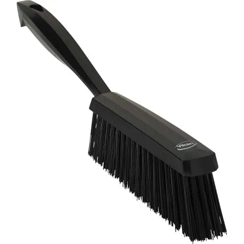 This is a dusting brush with a smooth, ergonomically designed handle. The medium strength bristles remove moist or medium sized particles, such as sugar, chocolate, pastry, vegetable peelings. It is also used as a dustpan brush on floors.