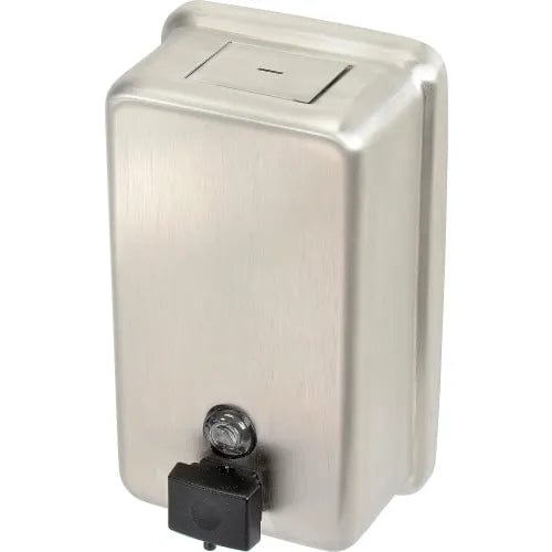 ClassicSeries™ Soap Dispenser is ideal for restrooms in offices, restaurants, health care facilities, schools, hospitals, and more. Vertical tank is constructed of durable, corrosion resistant stainless steel with a satin finish, and is vandal-resistant. Valve dispenses commercially marketed all-purpose hand soaps. Features concealed wall fastening, with hinged filler top that requires special key to open. Valve operates with less than 5 lbs. of force. Soap refill window allows for easy maintenance. 40-oz. capacity. Dimensions: 4-3/4"W x 3-1/2"D x 8-1/8"H.