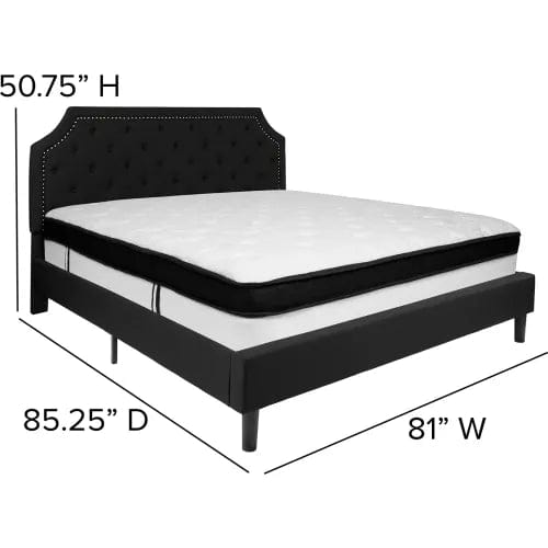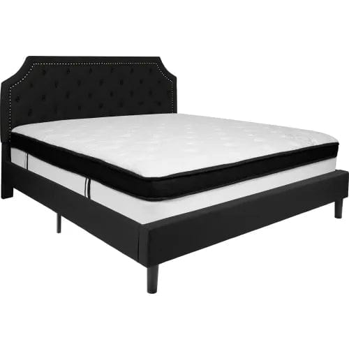 If you're looking for a new bed that's elegant but not boring you have come to the right place. This cutout panel headboard platform bed and hybrid mattress set has everything you need. Don't worry about having to shop two separate places for the bed frame and mattress. This bedroom set comes with a king sized platform bed frame that supports a pocket spring and memory foam bed mattress in a box. The panel headboard features a cutout design and gorgeous nail trimming with button tufted upholstery. The foam is CertiPUR-US Certified so it's free from heavy metals, phthalates, BPDE, formaldehyde and has reduced VOCs so you can rest easy knowing your indoor air quality won't be compromised. The low set frame will keep your space feeling open and uncluttered. If you're worried about having to lift a box spring or foundation you have no worries here. The pocket spring and foam mattress sits atop 15 wooden support slats. The 12" memory foam pocket spring mattress provides superior motion isolation and supports the contours of your body. The mattress instantly starts expanding once you cut the plastic and will return to its original shape in 48 to 72 hours. You may never want to leave your room when you purchase this upholstered platform bed and mattress combo.