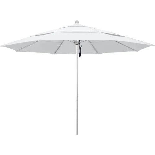 11' Venture Series Patio Umbrella With Silver Anodized Finish, Aluminum 2 Piece Center Pole, Fiberglass Ribs, Pulley Lift With Pin Stop, With Olefin White Fabric Canopy and Double Wind Vent. Solution Dyed Polyester Top Material. 1 year against defects and fade warranty.