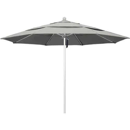 11' Venture Series Patio Umbrella With Silver Anodized Finish, Aluminum 2 Piece Center Pole, Fiberglass Ribs, Pulley Lift With Pin Stop, With Sunbrella 1A Granite 5402 Fabric Canopy and Double Wind Vent. 1 year against defects and fade warranty.
