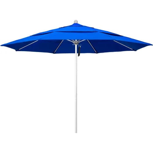 11' Venture Series Patio Umbrella With Silver Anodized Finish, Aluminum 2 Piece Center Pole, Fiberglass Ribs, Pulley Lift With Pin Stop, With Sunbrella 1A Pacific Blue 5401 Fabric Canopy and Double Wind Vent. 1 year against defects and fade warranty.