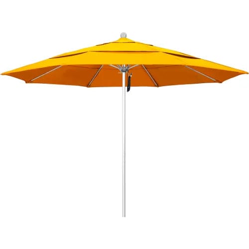 11' Venture Series Patio Umbrella With Silver Anodized Finish, Aluminum 2 Piece Center Pole, Fiberglass Ribs, Pulley Lift With Pin Stop, With Sunbrella 1A Sunflower Yellow 5457 Fabric Canopy and Double Wind Vent. 1 year against defects and fade warranty.