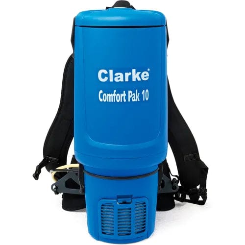 The newest member of Clarke®'s soft floor line is the Comfort Pak back pack vacuum. It features an ergonomic frame that was designed by backpackers for support and stability, lightweight, easy to maneuver, with an easy mess-free bag change. Ergonomic frame with padded shoulder straps and lumbar support provide support and stability while allowing air to flow over the operator's back. The weight is mainly distributed over the hip area. The unique harness design is very comfortable and reduces stress on the operator. Quieter than most at 62 dbA, the Comfort Pak has lots of power and capacity. Onboard tool storage available for quick and easy tool change. The complete tool kit is ideal for carpet and hard floors, overhead, and detail cleaning operations. 10 qt. capacity.