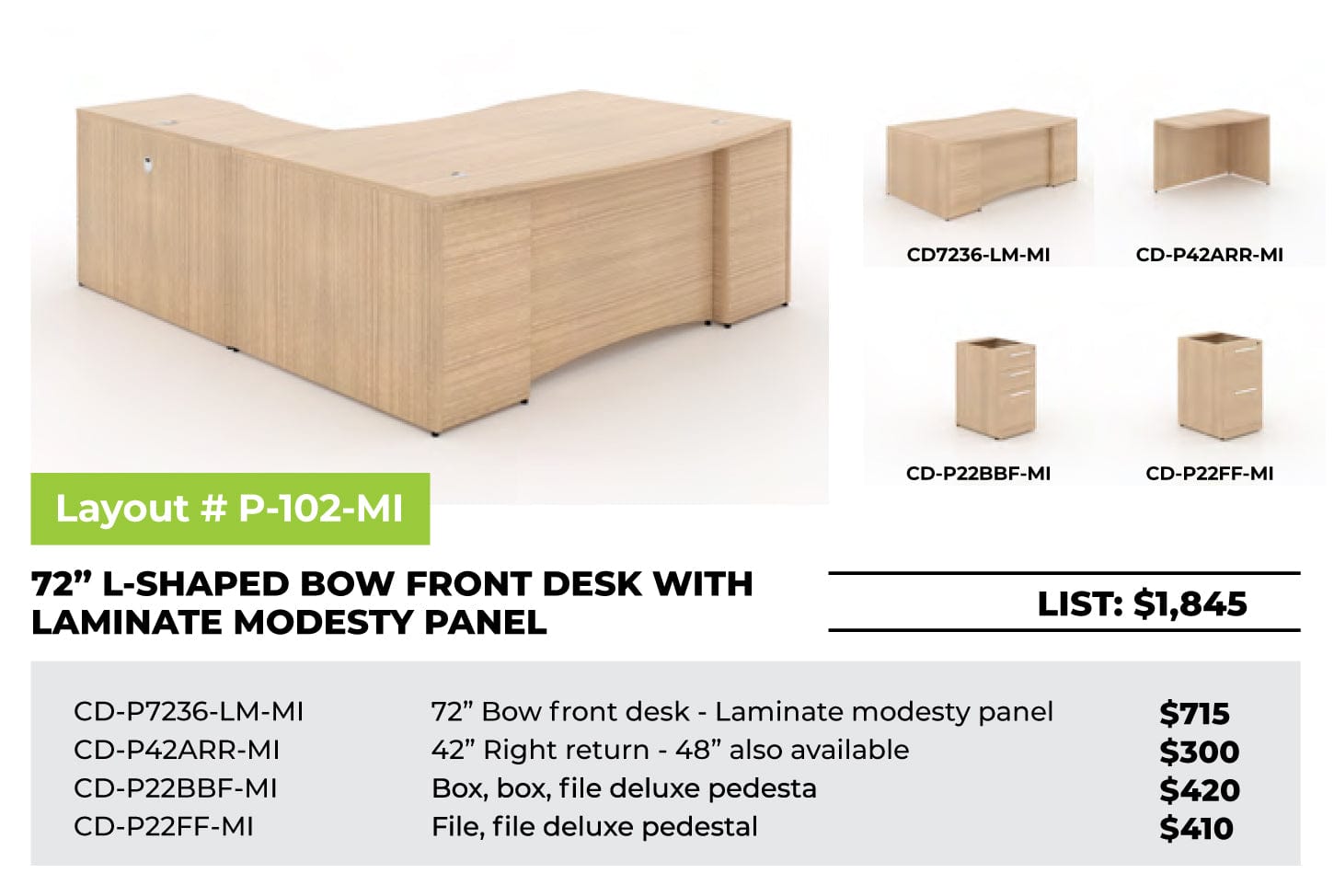 72" L Shaped Bow Front Desk w/ laminate Modesty Panel