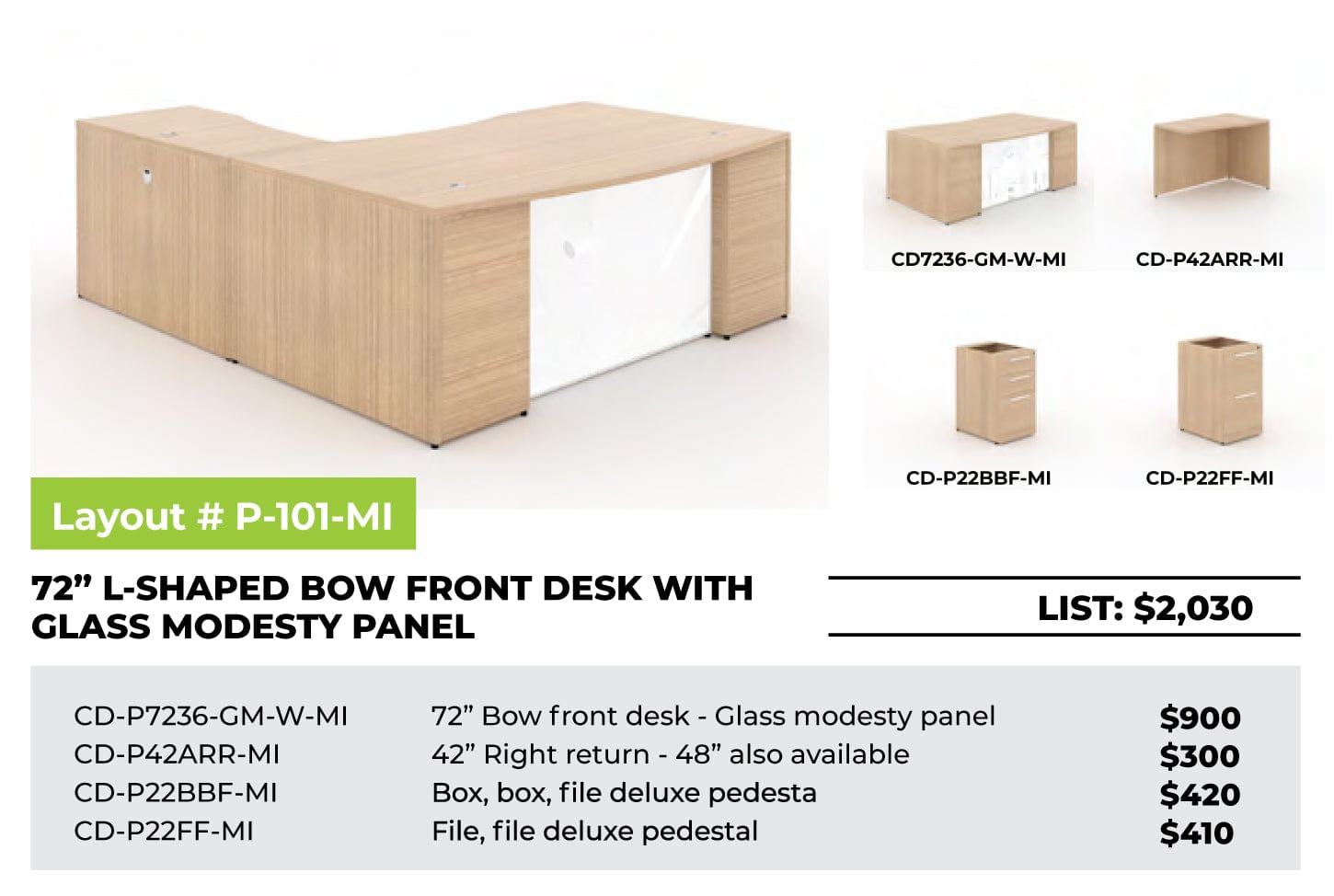 72” Bow front desk - Glass modesty panel |