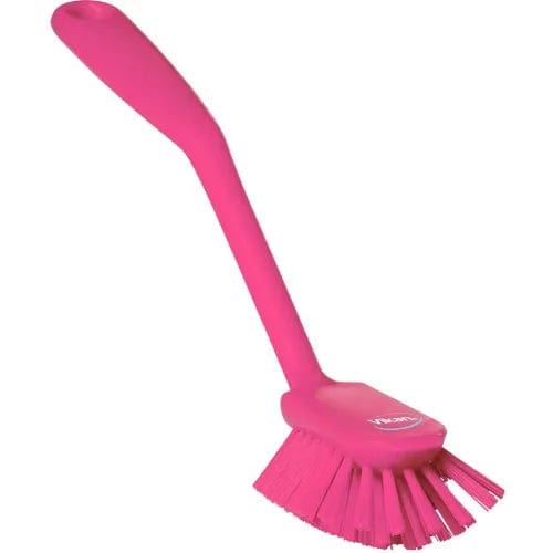 The head of this fully color-coded dish brush has angled bristles that reach perfectly into corners. It has a small scraper at the tip to loosen stubborn dirt. The raised angle of the grip promotes quick and effective cleaning because of the operator's hand and arm are in the ergonomically correct position.