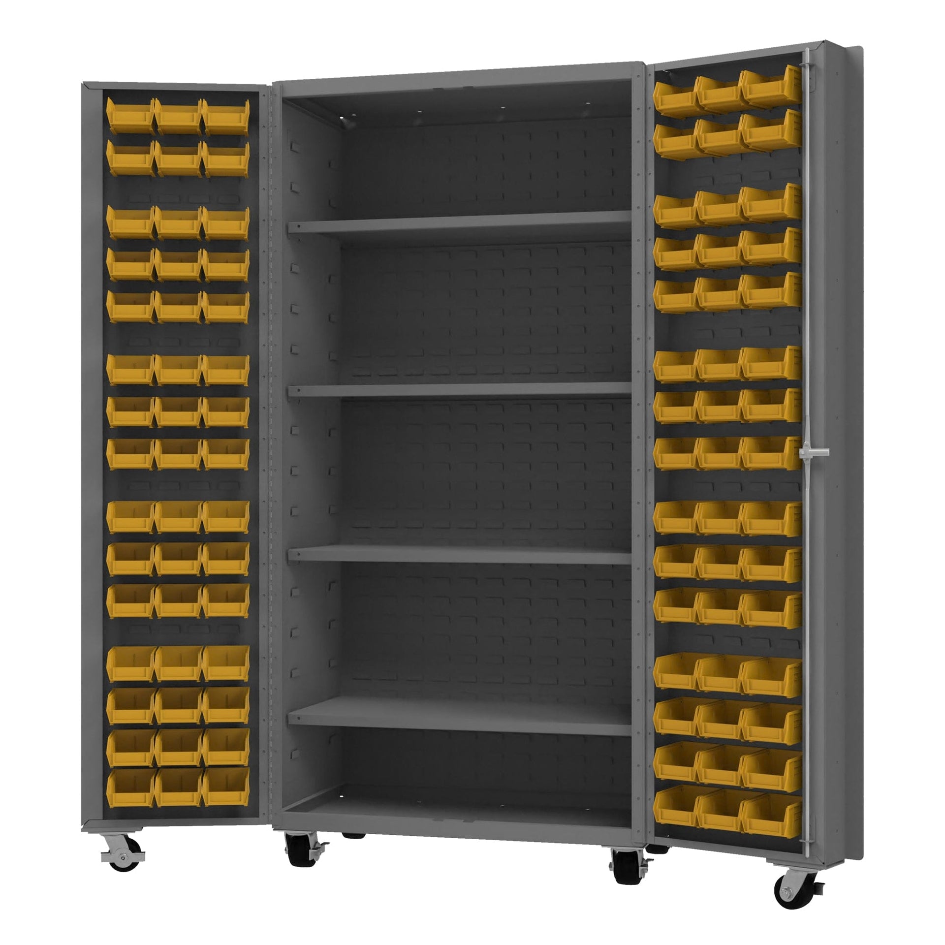 - Durham Mobile Cabinet, 14 Gauge, 96 Bins, 4 shelves, 36 x 24 x 76