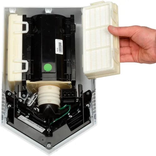 The new Dyson Airblade™ V hand dryer incorporates a reprogrammed 1000W digital motor and precision air apertures to make it 30% quieter than its predecessor when measuring loudness. Protruding just four inches from the wall, it complies with ADA guidelines without additional recessing costs. The Dyson Airblade™ V hand dryer uses touch-free operation and HEPA filtered air to dry hands hygienically in 12 seconds. Because of its reprogrammed motor, the new Dyson Airblade™ V dryer produces just 2.4g of CO2 per dry and costs $31 to operate per year. Warranty: 5 year parts, 5 year limited labor. Overall dimensions: 9-1/4"W x 4"D x 15-1/2"H.