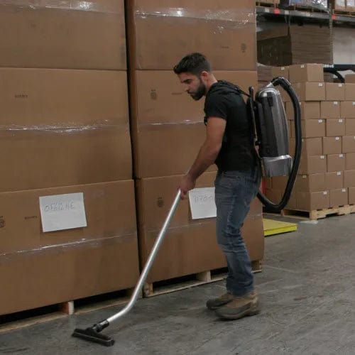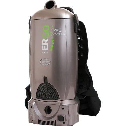 The Atrix Ergo Pro Cordless Backpack vacuum, VACBPAIC, is an excellent option for janitorial/sanitation, contract cleaning, offices, warehouses, and locations that do not offer an AC power source, or where corded vacuums may become a safety hazard. The low-profile cordless backpack vacuum is designed with a heavy-duty, padded harness that includes onboard accessory holders and an adjustable chest strap which makes the vacuum comfortable to wear for long durations and easy to navigate constricted spaces. The 26V cordless vacuum is powerful with its 300 watt cleaning power which produces 70 CFM. The Ergo Pro cordless has a 60 minute run time and a quick 4 hour charge. The cordless backpack vacuum features four levels of filtration that consists of an eight quart HEPA filtration bag, cloth shakeout bag, HEPA premotor filter, and exhaust filter. The cordless vacuum comes complete with 1.5" industry standard hose and utensils that can be used for cleaning many applications.