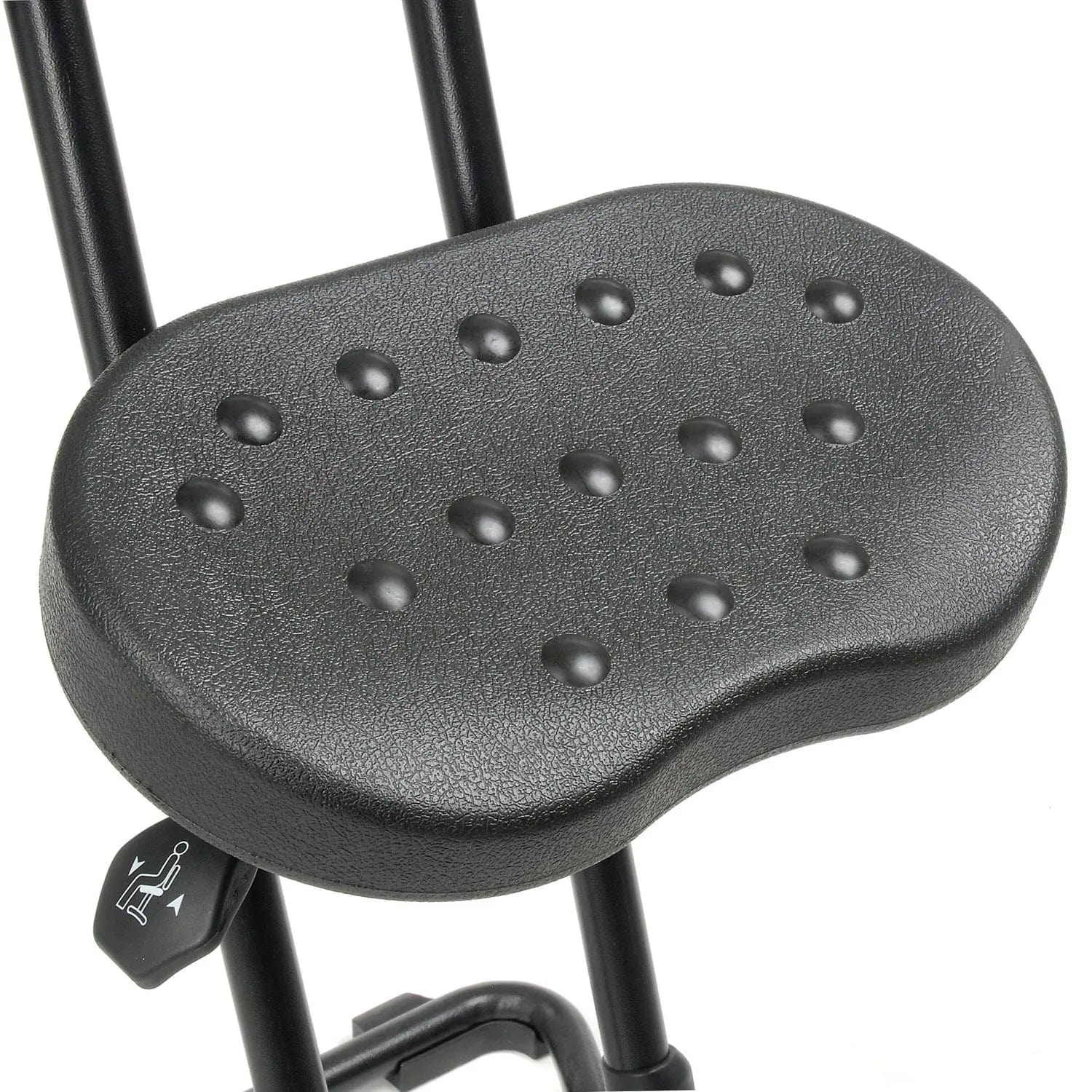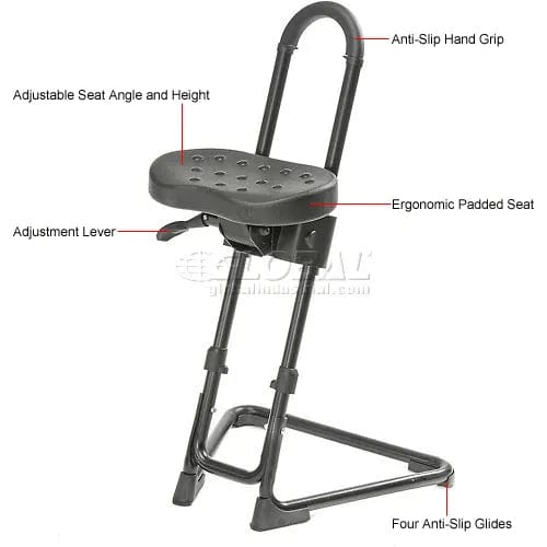 ShopSol ergonomic sit stand stools are ideal for preventing fatigue in garages, workshops, factories and more. Sit stand stools provide relief from standing while providing support to remain in an upright position. Base shape allows stable positioning up close to work stations and production lines. Ergonomic, padded polyurethane seat swivels in either direction and tilts forward up to 20 degrees. Seat height is adjustable from 22-3/4" to 32-3/4" to suit workers of almost any size. Matte black tubular steel base includes four strong nylon anti-slip glides to provide stability on most flooring.
