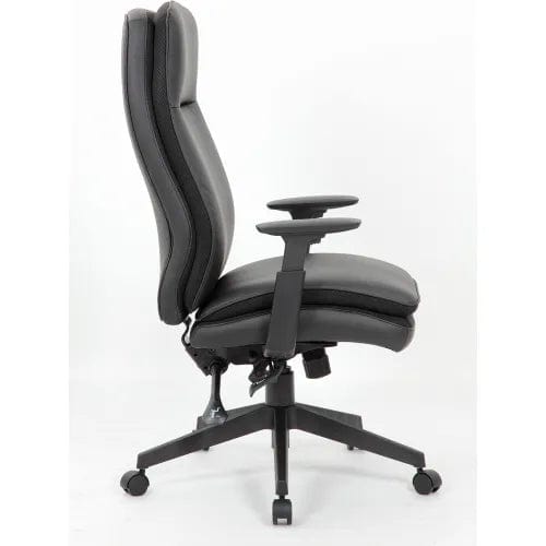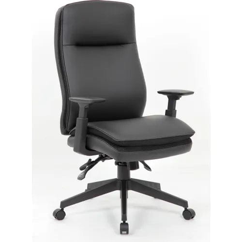 This Caressoft high back executive chair brings comfort and stability to any office environment. It features beautiful and durable Caressoft upholstery and high-back styling with exemplary lumbar support. Adjustable height arms. In addition, the chair has pneumatic gas lift seat height adjustment, an adjustable tilt tension control, a spring tilt mechanism, and locks in the upright position. Its large 27" 5 star nylon base provides stability while affording plenty of mobility thanks to its five hooded double wheel casters.