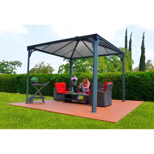 The Palermo gazebo gives you that outdoor gathering space that you've always wanted. Integrated channels for hanging the optional Curtain or Mosquito Net kits allow you to give your gazebo a more room-like feel. Gutters and downspouts channel water towards the four corners and away from the sides to keep you dry. Decorative but functional, the roof ornament keeps rain out and vents smoke and humidity. The Palermo gazebo sets up quickly and easily and can be attached to any surface with the included anchors.
