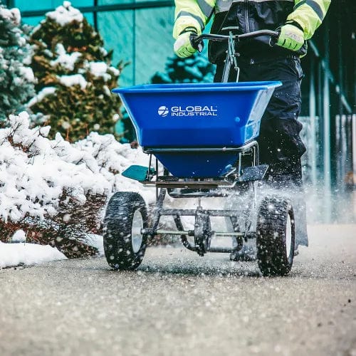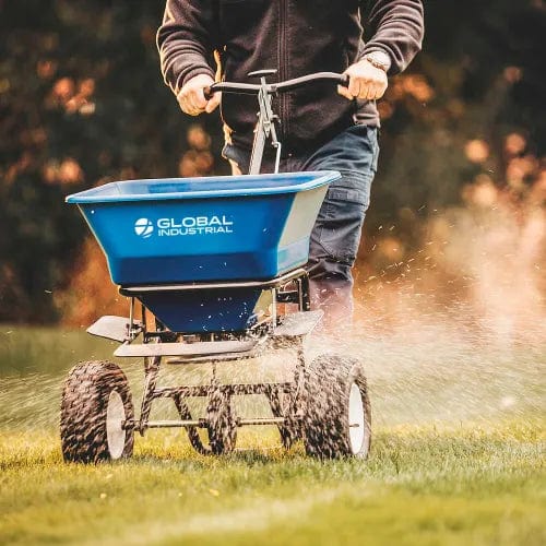 The Global Industrial™ Universal Spreader is ideal for spreading seed, fertilizer, lime, ice melt, salt, and similar materials. Spreader features a welded steel frame and a large 100 lb. capacity plastic hopper with a screen that helps prevent materials from jamming. The spreader's enclosed gearbox with commercial-grade alloy gears and an integrated grease fitting ensure that the moving parts of the spreader are out of the elements and are easy to maintain. Comfort grip handle with flow regulator for ease of use. Large 13" pneumatic tires make pushing through grass, slush, and ice easy. Adjustable Spread Radius 3' to 30'. The included 3-flap adjustable deflector controls the spread pattern, while the rear deflector protects the operator's feet. Includes plastic cover to protect materials from rain, wind, and other elements. Easy assembly. 1-Year Limited Warranty.