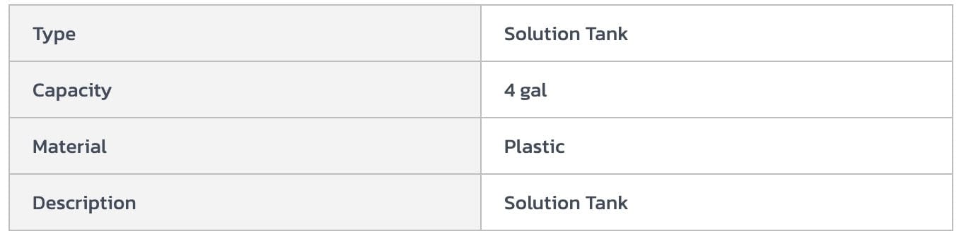 External mounted 4 gallon solution tank helps improve cleaning quality and efficiency of Floor Machines (sold separately). Provides a tank for storing cleaning solution. 4 gallon capacity.