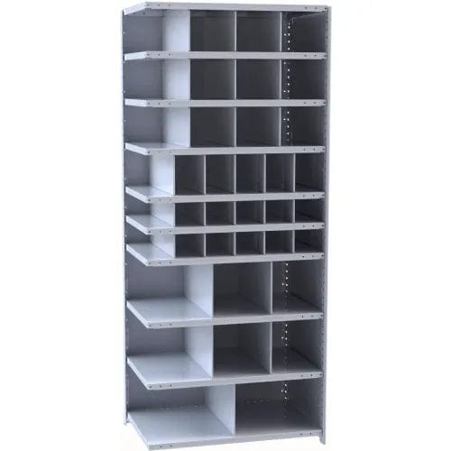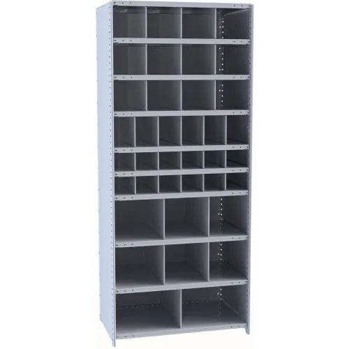 Centerline Dynamics Closed Metal Bin Shelving Starter Hallowell Hi-Tech Metal Bin Shelving 36"W x 18"D x 87"H 725 Dark Gray (12) 9"W x 9"H, (6) 6"W x 9"H, (12) 6"W x 6"H, (6) 12"W x 12"H, (2) 18"W x 12"H Bins