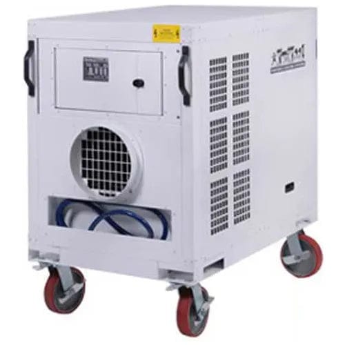 The Model KPO5-43 (nominal 5-ton or 60,000 BTU) is a compact portable 32" wide and will fit through a standard 36" door. This small footprint that is ideal for difficult applications that require moving cold air to a hard to reach heat load, such as a sealed interior room. They provide temporary cooling needed when dedicated A/C units are incapacitated and in the midst of repair or service. They can be placed outdoors and ducted into the building or placed inside and ducted into an interior room. The KPO 5-ton model offers advanced airflow capabilities, up to 50' cold air return and supply and up to 65' of hot air exhaust ducting. The KPO5-43 runs on a 460-volt/20-amp 3-phase circuit, which must be hard wired by a qualified electrician. The condenser has Low Ambient Temperature Capability using a Variable Frequency Drive that will operate at temperatures below freezing. The heavy duty base has removable wheels and fork lift skid access for easy movement, setup, and transport. All KPO models come with a high functional phase monitor for electrical protection from unacceptable power, which damages electrical components. The unit also comes with an internal high lift condensate pump. And, KwiKool products are proudly made in USA. This product has a limited warranty of 1 year.