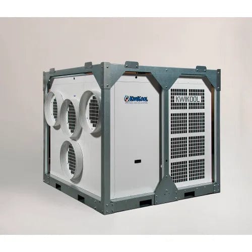 The Model KPO25-43 (25-ton or 270,000 Btu) is the most versatile unit in size and capabilities compared to other portables with similar capacity. The KPO25-43 has an extremely small footprint that is ideal for difficult applications with limited available space for outside equipment. The KPO25-43 model is 66" wide, 66" long, and 60" tall. The heavy-duty 12 gauge steel base offers fork lift skid access for easy movement, setup, and transport. The unit is placed outdoors with a duct running into a building space, using high static blowers to reach an isolated heat load, such as a sealed interior room. This KPO model offers advanced airflow capabilities, up to 75 feet of 20" cold air supply and return ducts, which eliminates the need for the addition of a booster blower.