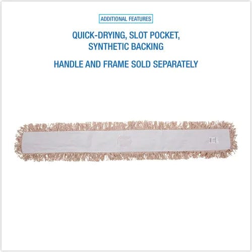 Ten-ply, Hygrade white cotton, cut-end design enhances durability while minimizing snags. Quick-drying, absorbent, slot pocket style with synthetic backing. Used for attaching a mop and dusting floors. Works with spray or liquid dust mop treatment and other solutions used to dust floors and add shine. Great for general purpose cleaning and wiping floor surfaces of various materials. Mop and dust mop frame are sold separately.