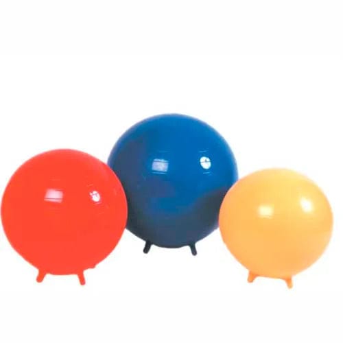 Unique inflatable ball has stabilizing "feet" that keep the ball from rolling when not in use. When in use the weight of the person makes the "feet" retract into the ball so it can function like any other inflatable exercise ball. Non-slip surface is ribbed for extra security. ?Under" inflate to give a soft, mushy feel or fully inflate for a firm, bouncy feel. Ball can support up to 300 pounds. Comes in a polybag. Available in various color-coded sizes.