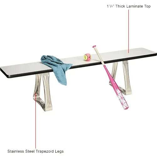 Provide seating for locker rooms, changing rooms, and similar areas with our Global Industrial™ 60"W Locker Room Bench with Laminate Top. This bench features a practical low-maintenance laminate top that is supported by resilient, stainless steel trapezoid pedestals. It is simple in both design and setup, making it idea for a wide variety of facilities from gyms to spas. Unit must be anchored to floor for maximum stability. 1-Year Limited Warranty.