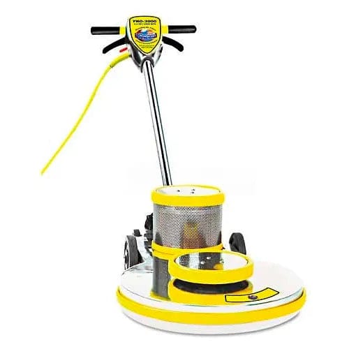 High-powered, D/C rectified motor ensures reliable, brown-out-free, high-speed operation. Precision-balanced all-metal chassis helps users maintain even pad pressure, enabling more consistent results. Interlocked, non-conductive safety switch minimizes the potential for injuries. Low-profile apron with full-coverage bumpers simplifies maneuverability while protecting walls and baseboards. Flexible pad holder automatically conforms to floor irregularities. Fully adjustable handle may be set to accommodate nearly anyone. PRO-2000-20: 2,000 rpm, 20-inch pad. Floor Machines Type: Burnisher; Handle Type: T-Grip; Brush Diameter: 20".