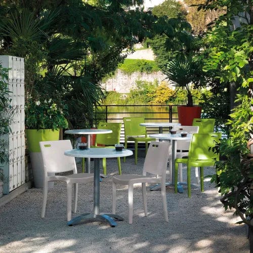 The versatile and contemporary design of the Metro Chair features a low back and wide seat. It has a built-in handle for easy placement, along with a fine texture to resist scratching. Stacks for easy storage.