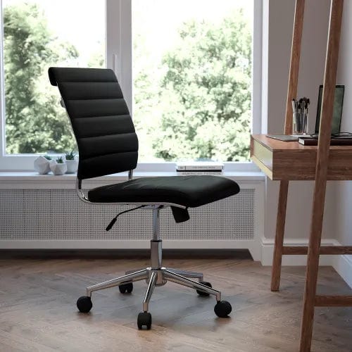 Revive your drab looking office with this ultra-modern executive office chair to turn your office into something extraordinary. Sporting an armless silhouette, you'll have more space between guests when used in board rooms and conference rooms. An integrated back bar provides a convenient position to hang garments such as coats and jackets. Fall into comfort with the ribbed back desk chair backed by curved lumbar support. With no arms to contend with you'll have no issues pulling up under any desk. Adjust the chair to your desired height by utilizing the lever underneath the seat that also locks the chair in an upright position. When you want to lean back pull the lever out and use the knob to adjust the force that'll be required to recline. If you need to update the seating at your office desk or conference table, this ribbed office chair is up for the task. Coordinate your entire office with our mid-back and high back versions.