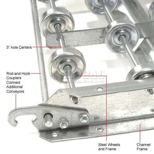 Skate wheel conveyors offer smooth movement of multi-sized material. 2" diameter ball bearing plated wheels and 3" axle centers. 2-1/2" x 1" x 12 gauge galvanized steel channel frame with hook and rod coupling is designed for maximum strength to move the heaviest items. Capacity is 65 lbs. per wheel.