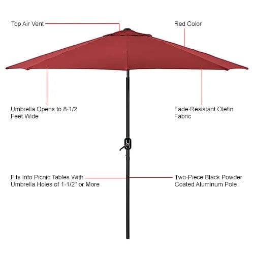 When you need shade pronto for outdoor spaces for hotels, restaurants, and cafes, introduce the Global Industrial™ Outdoor Umbrella with Tilt Mechanism. This commercial umbrella is made of fade-resistant olefin fabric and opens to 8-1/2 ft. to provide plenty of shade. Sturdy black powder-coated aluminum pole comes in 2 pieces which snap in together for easy assembly. 8 aluminum ribs on the underside keep the umbrella steady during sporadic windy conditions. Crank-lever makes it easy to set up and open. Tilt-button allows you to shade your area throughout the day. Fade-resistant for up to 1,000 hours.