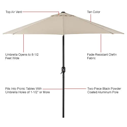 When you need shade pronto for outdoor spaces for hotels, restaurants, and cafes, introduce the Global Industrial™ Outdoor Umbrella with Tilt Mechanism. This commercial umbrella is made of fade-resistant olefin fabric and opens to 8-1/2 ft. to provide plenty of shade. Sturdy black powder-coated aluminum pole comes in 2 pieces which snap in together for easy assembly. 8 aluminum ribs on the underside keep the umbrella steady during sporadic windy conditions. Crank-lever makes it easy to set up and open. Tilt-button allows you to shade your area throughout the day. Fade-resistant for up to 1,000 hours.