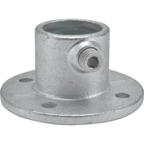 Medium Flange Pipe Fitting is commonly used to mount a 1-1/4" diameter horizontal pipe to the wall. Durably constructed with galvanized iron for corrosion resistance and low long term maintenance. Pipe is joined to flange with hardened set screws for secure placement. Anchor hole is slightly larger than ½" diameter.