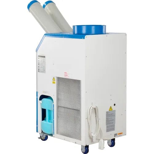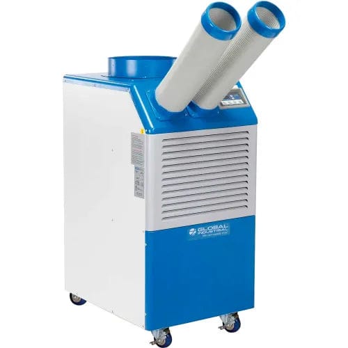 With this 13,200 BTU Global Industrial™ Portable Air Conditioner, you can provide spot cooling between 64 and 86°F and 32 to 86°F room cooling for up to 355 ft2 in industrial plants, server rooms, hospitals, laboratories, and where electrical equipment creates additional heat within 64 to 113°F ambient temperature range. The thermostatically-protected compressor has two fan speeds to give you control of the cooling. Removable filters clean the air as it cools to improve air quality, and they are washable for easy maintenance. Two Cold Air Nozzles are included and are recommend for use with the air conditioner with replacements available separately. The housing is made of metal for durability and moves easily on four swivel casters, two locking, for optimal portability as needs change. Limited 3-Year Warranty.