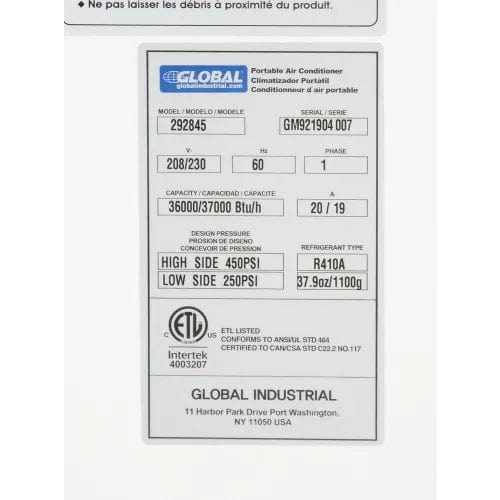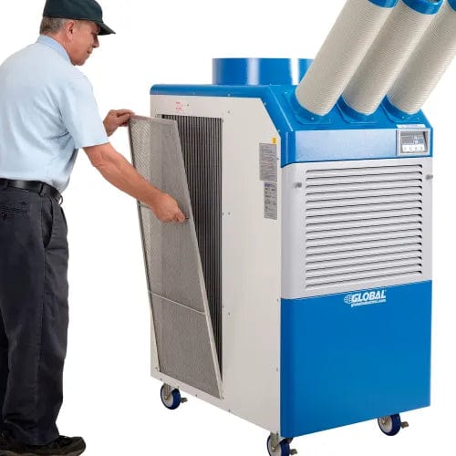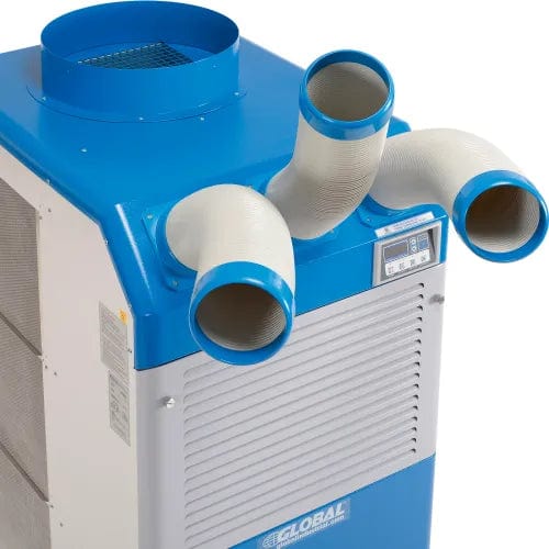 Industrial portable air conditioners are designed for economical spot cooling in industrial plants, server rooms, hospitals, laboratories, and anywhere electrical equipment creates a heat load. Global 3 Ton Portable Air Conditioner features 37,000 BTU operation that cools up to 1,075 square feet with cooling temperature range of 64° - 113°F . Two fan speeds. Single phase motor. Removable washable air filters for easy maintenance. This unit also includes the three 5" Cold Air Nozzles that are recommend for use with the air conditioner. Replacements are sold separately. Thermostatically protected compressor includes high and low pressure warnings. Unit moves easily on four swivel casters (two locking). ETL & cETL listed. Optional Warm Air Exhaust Ceiling Duct Kit is available for purchase separately. This product has a limited warranty of 3 years.