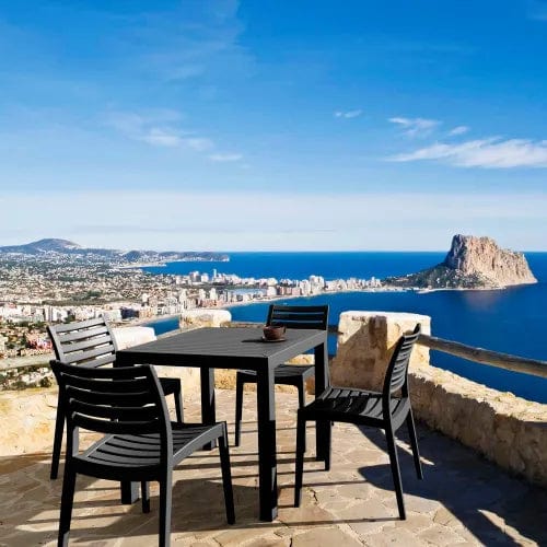 Dark Gray Ares resin dining set with 4 chairs and one square dining table. Super sturdy commercial strength. Chairs are made from commercial grade resin with gas injection molded legs. Both chairs and table offer 100% polypropylene construction. No metal parts. Chairs are heavier than most resin chairs of its type. Dining set is perfect for heavy use areas. Set items are 100% resistant to outdoors, sun, snow, salt. Resin is virtually maintenance free.